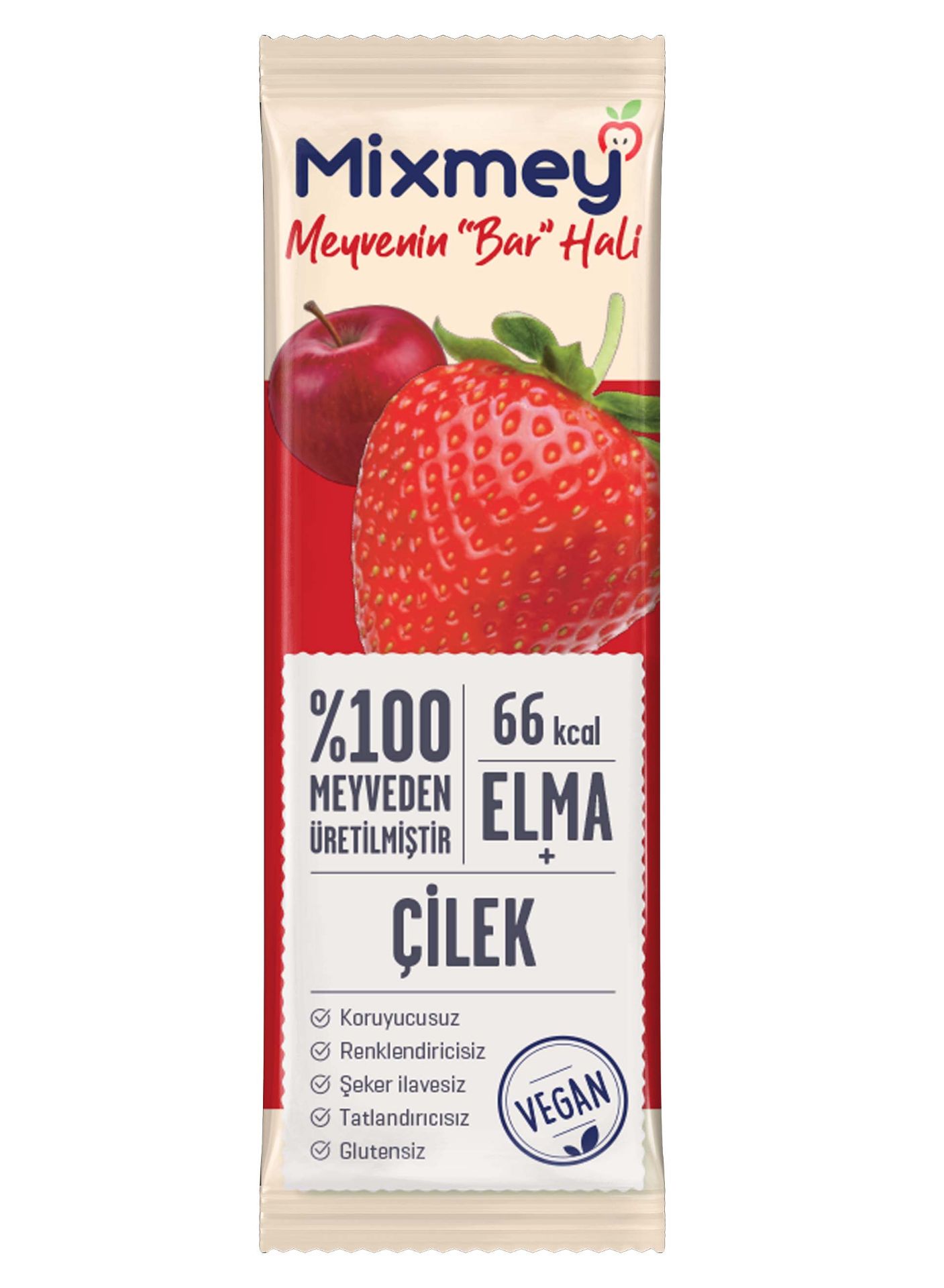 Ilave seker, tatlandirici, renklendirici, koruyucu ve glüten içermeyen “Elmali ve Çilekli Meyve Bar” lezzetimiz vegandir.